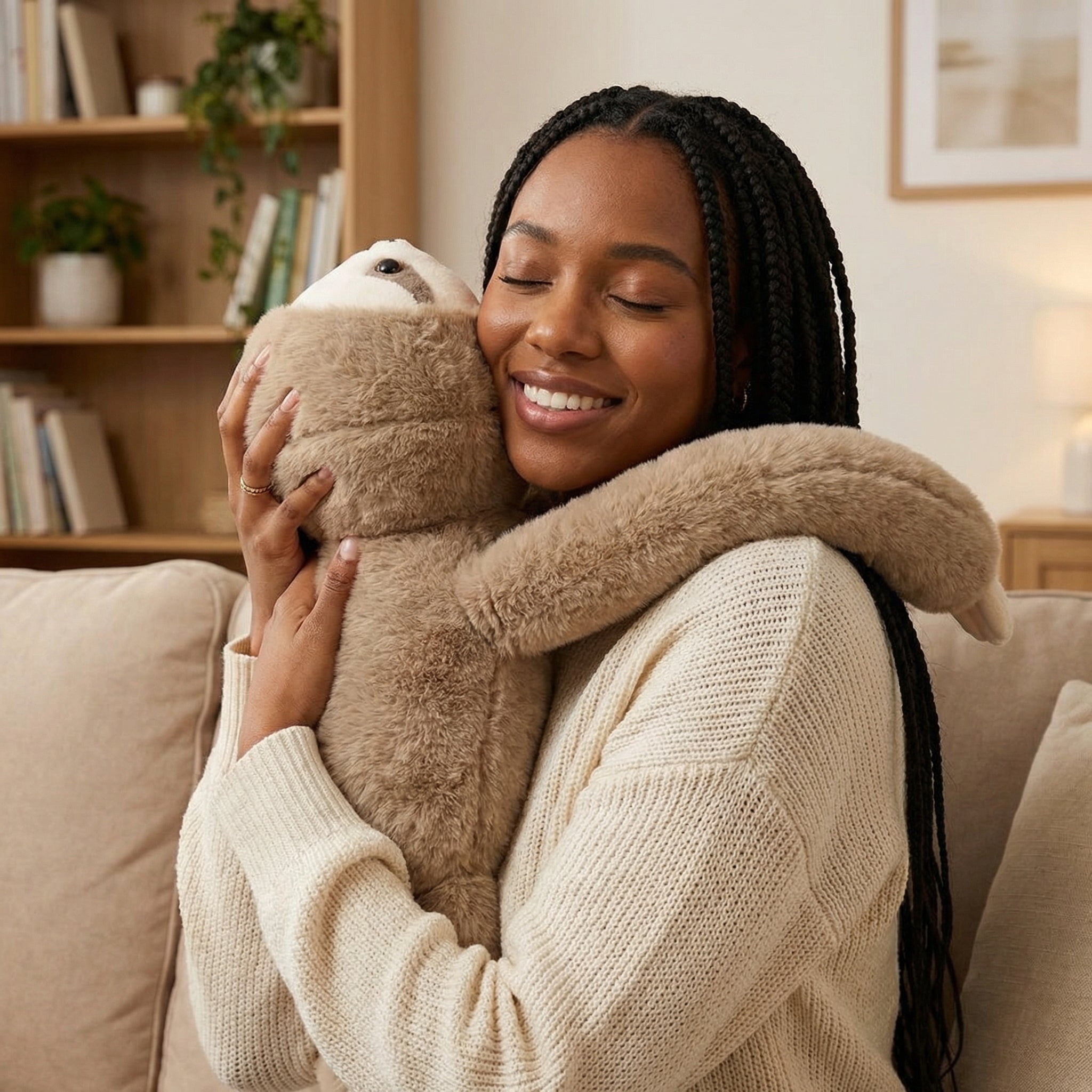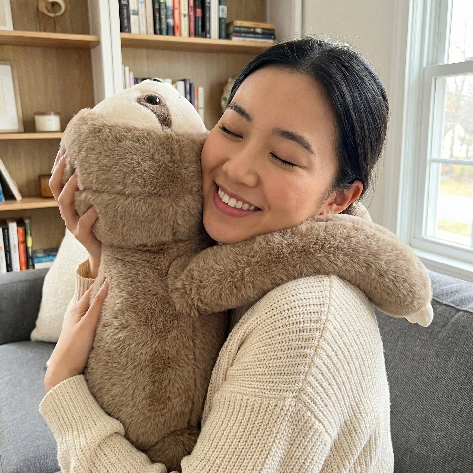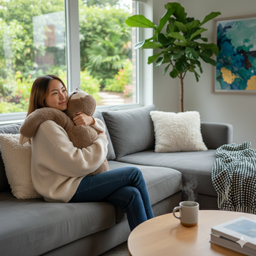 Elle pèse 1 kg / 2,2 lb — juste assez pour offrir une pression apaisante sans être trop lourde. Le poids est réparti dans les bras pour qu’elle puisse réellement vous enlacer et rester contre vous pendant que vous travaillez. Elle est parfaite à câliner pendant le travail, la détente ou le sommeil.